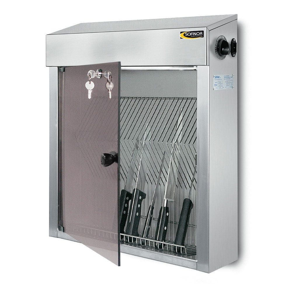 The Sofinor Knife Cabinet is an effective way to sterilise your small knives and utensils. Made of stainless steel, the cabinet includes a 120 minute timer and has intregrated safety features such as auto cut out when the door is opened. With an inclined top surface helping to comply with hygiene standards
